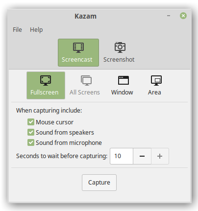 Kazam is a simple yet effective screen recording tool with a clean Graphical User Interface that allows you to capture your desktop sessions as video sessions. This tool also gives you the flexibility to select from following range of options to determine how you want to record your screen: